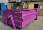 Roll-off dumpsters have an open top and are rectangular in shape. You can chuck light waste over the wall or load heavy goods through the swinging door.